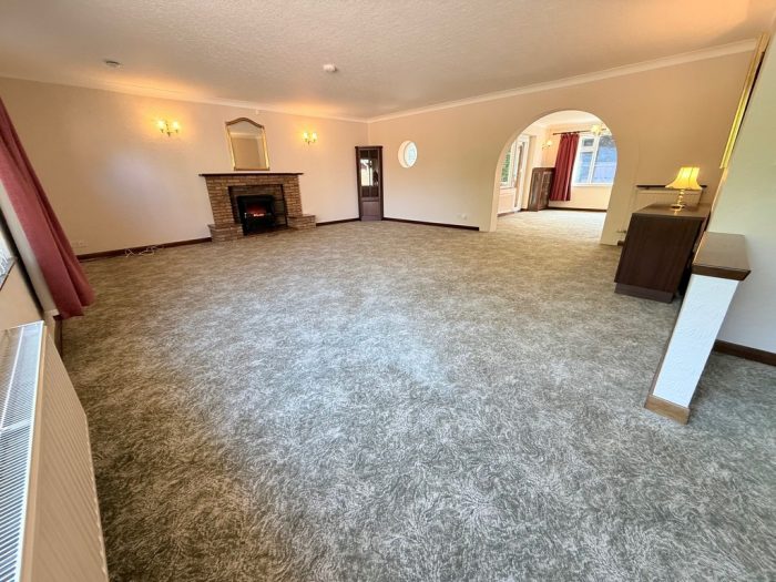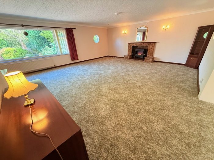 SPACIOUS LOUNGE: 27' 10" x 20' 0" (8.5m x 6.1m) carpet; two radiators; brick feature fireplace with mantle and tiled shelves either side with wood burner effect electric fireplace; two decorative round porthole windows to front and rear; large double glazed window with blinds, curtain pole and curtain overlooking front aspect and wall lights (Agents Note: there is currently some furniture in situ which can be left or removed at tenants requirements, consisting of sideboard, a corner glass fronted unit, nest of tables and three drawer unit). Archway leading into;