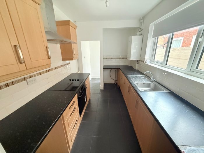 KITCHEN 14' 10" x 7' 4" (4.54m x 2.26m) tiled floor; fully fitted kitchen with a range of wall and base units; newly fitted oven and hob with extractor hood over; stainless steel sink with drainer; recess area for appliances; wall mounted boiler; double glazed window with newly fitted blinds.