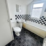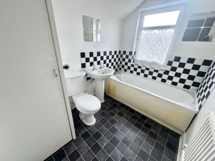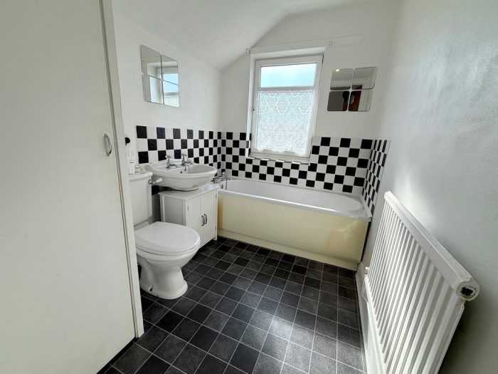 BATHROOM 8' 6" x 5' 10" (2.6m x 1.8m) vinyl flooring; double-glazed window to rear; radiator; cupboard housing the boiler; white suite comprising of bath with mixer tap and shower head attachment; freestanding sink and low-level WC.