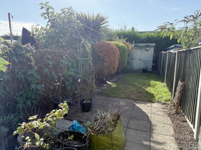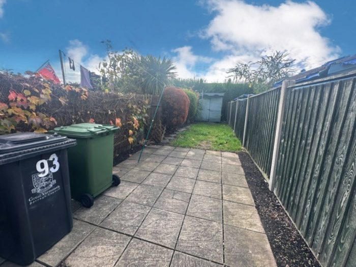 OUTSIDE To the front of the property is a small enclosed yard and to the rear of the property a small, enclosed yard area immediately off the utility with right of way passage beyond that with enclosed garden off set with patio, lawn area and garden shed.