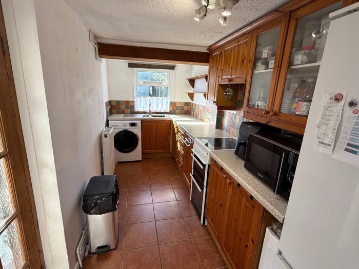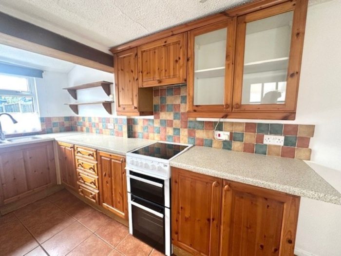 KITCHEN 13' 9" x 5' 10" (4.2m x 1.8m) tiled floor; double-glazed window to rear; radiator; range of wall and base units with work surface over; freestanding oven;1½ sink drainer. Door to: