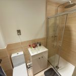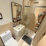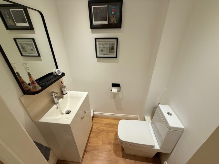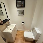 WC LVT flooring with under floor heating; low level WC; hand wash basin within vanity unit, wall mounted mirror over.