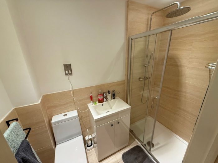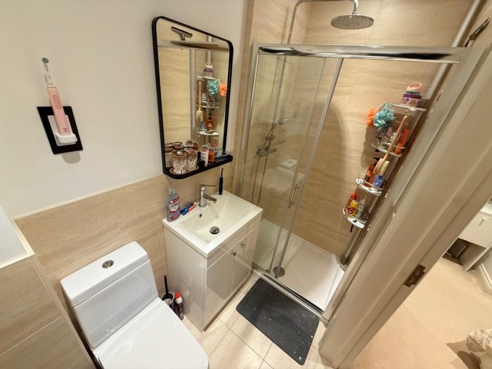 EN-SUITE 7' 6" x 3' 7" (2.3m x 1.1m) tiled floor with under floor heating; modern white suite comprising of low level WC; hand wash basin with vanity unit; walk-in shower with handheld and waterfall showerheads; shaver point.