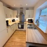 KITCHEN 2'4"x 2'3" LVT flooring; under floor heating; mottled double-glazed window to side; range of modern, cream wall and base units with integrated appliances to include fridge freezer, washing machine and dishwasher, work surface over; stainless steel sink and drainer; built-in oven, hob and extractor hood.