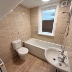 BATHROOM modern white suite comprising low level WC; hand wash basin; bath with electric shower over; radiator; double-glazed window; vinyl flooring.