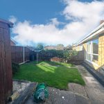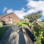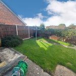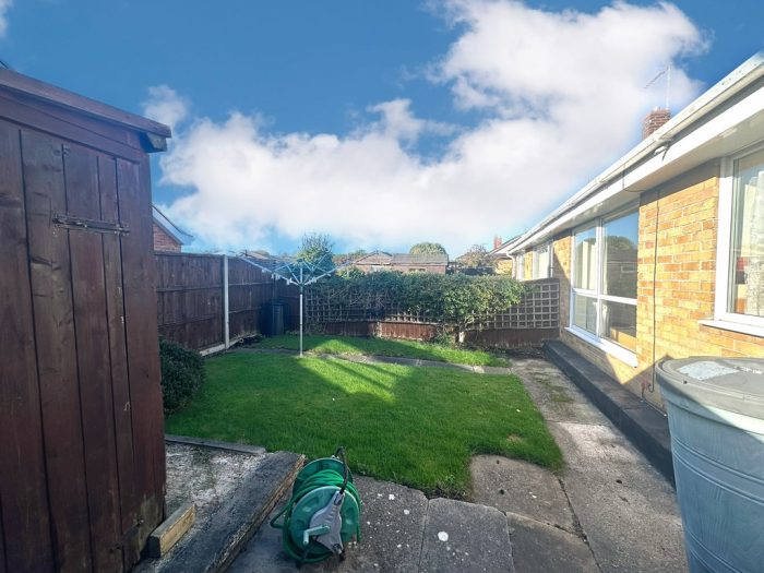 OUTSIDE The front garden is a spacious corner plot with patio walkway, beyond which is a grass area, brick wall surrounding. Driveway gate to rear garden. To the rear are two sections of lawn, a shed, washing line, patio area and gate for bins.