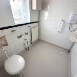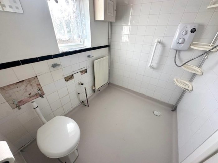BATHROOM 6' 6" x 5' 2" (2m x 1.6m) wet room with waterproof flooring; double-glazed window to front; single radiator; low level WC; sink and electric shower.