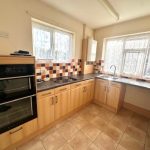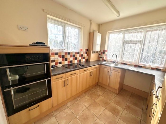 KITCHEN 9' 6" x 8' 6" (2.9m x 2.6m) tile effect vinyl; double-glazed window to front garden and one to rear garden; range of base units with work surface over; built-in oven and grill; electric hob; 1½ bowl sink and drainer.