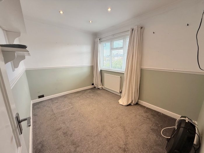 BEDROOM 2 10' 5" x 8' 2" (3.2m x 2.5m) carpet, radiator, double glazed window with blinds and curtains to rear, shelving, wall mounted tv.
