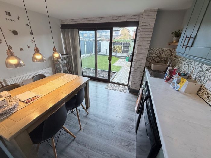 KITCHEN 3' 8" x 2' 9" (1.12m x 0.84m) laminate flooring, radiator, sliding patio doors to garden, range of wall and base units with work surface over, free standing washing machine (left as goodwill), dishwasher (left as goodwill), 1½ bowl sink and drainer, opening to further kitchen area with additional units and free standing oven with extractor hood over, free standing fridge freezer (left as goodwill), window overlooking front with blind, recessed storage area.