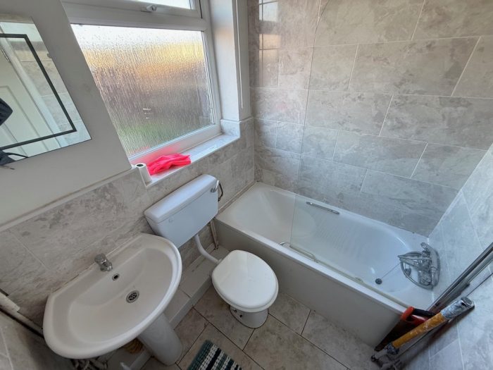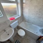 BATHROOM tiled floor, white suite comprising of low level wc, hand wash basin, bath with mixer tap and shower head over with shower screen to side, radiator, double glazed window to rear.