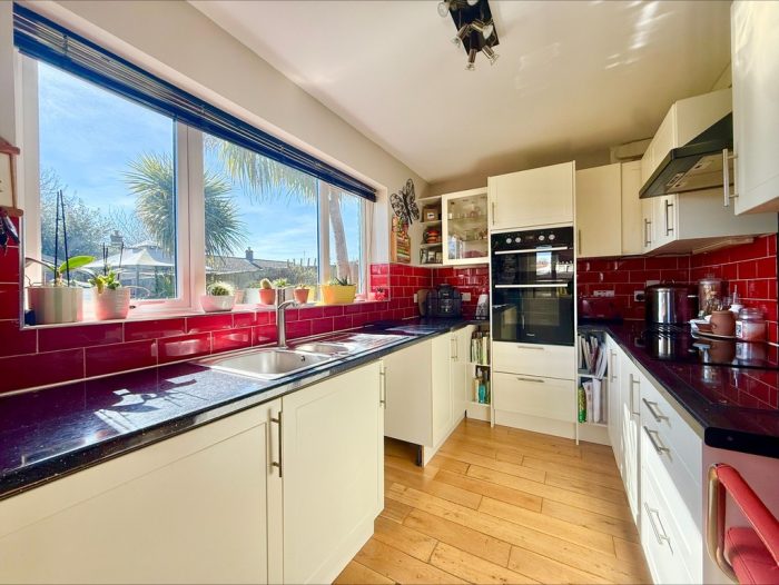 KITCHEN 12' 7" x 7' 1" (3.84m x 2.16m) fitted with a range of wall and base units with roll edge work surfaces over, inset stainless steel 1½ bowl sink with mixer tap over, plumbing for dishwasher, space for fridge freezer, built-in double electric oven, inset four ring electric hob with cooker hood over, tiled splashbacks, UPVC double glazed window to rear, oak flooring; UPVC double glazed door to side.