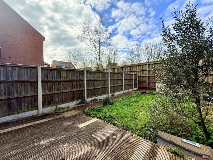 OUTSIDE To the front of the property is a driveway leading to integral single garage. To the rear of the property is a decked patio and pathway, lawn and plants.