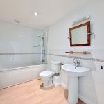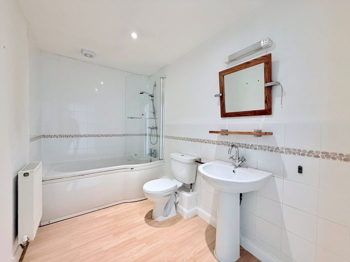 BATHROOM bath with curves shower screen, mixer tap, mains shower fittings, wc, pedestal hand wash basin with mixer tap, radiator, downlights, extractor fan.