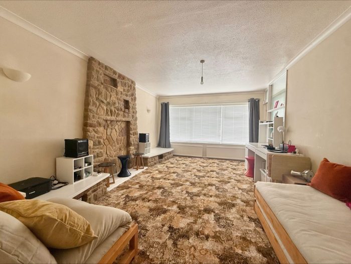 SITTING ROOM 17' 4" x 11' 8" max (5.28m x 3.56m) upvc double glazed window to front; Yorkstone feature fire surround with tv plinth.