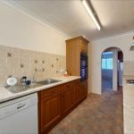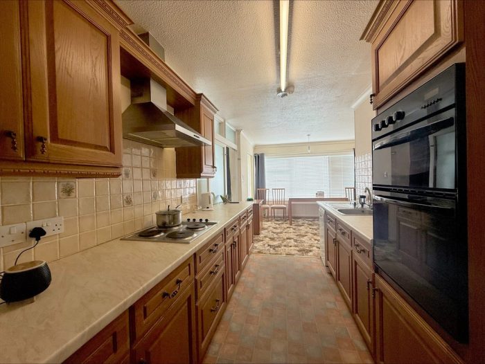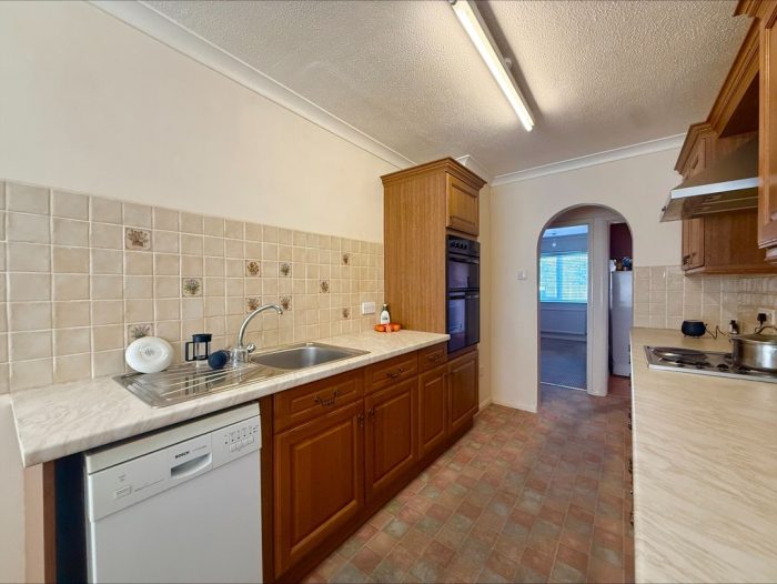 KITCHEN 10' 8" max x 7' 4" max (3.25m x 2.24m) fitted with a range of wall and base units with roll edge worksurface over; electric four ring hob with cooker hood over; built-in double electric oven; inset stainless steel single drainer sink with mixer tap over; plumbing for dishwasher; tiled splashback.