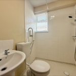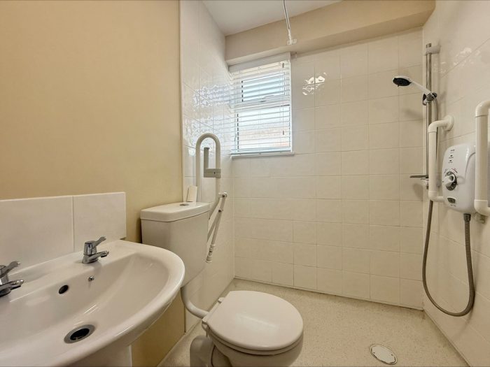 WET ROOM/SHOWER ROOM 6' 2" x 5' (1.88m x 1.52m) fitted with a white suite comprising pedestal wash basin; tiled splashback; low level wc; wall mounted electric shower unit with tiled splashback; upvc window to side; extractor fan.