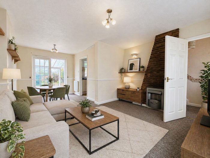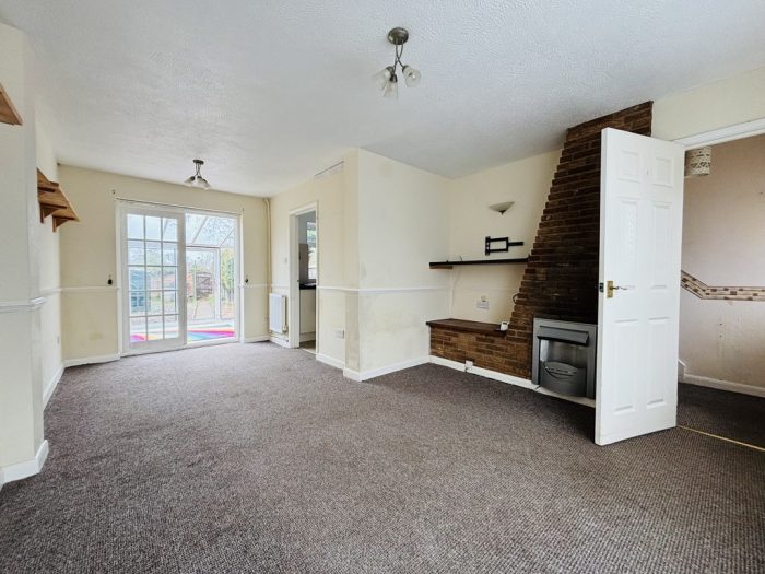 LIVING DINING ROOM 19' x 12' (5.79m x 3.66m) UPVC double glazed window to front, radiator, exposed brick chimney, wooden double French doors out to Sunroom.