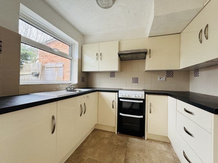 KITCHEN 7' 5" x 6' 5" (2.26m x 1.96m) mix of wall and base units, free standing electric oven,1½ bowl sink, space for fridge freezer, UPVC double glazed window, thermostat for oil boiler.