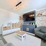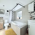 BATHROOM wc with push button cistern, bath with mixer tap and shower attachment, vanity unit with hand wash basin, mixer tap and cupboard under, frosted double glazed window, radiator, tiled flooring, extractor fan, downlights.