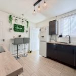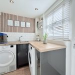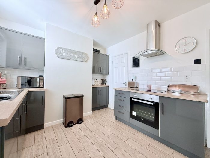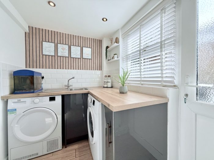 UTILITY ROOM 7' 9" x 5' 6" (2.36m x 1.68m) side window and door providing access to rear, L-shaped worktop, space and plumbing for washing machine and tumble dryer, 1 bowl sink with mixer tap, radiator, tiled flooring, downlights, extractor fan.