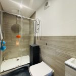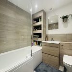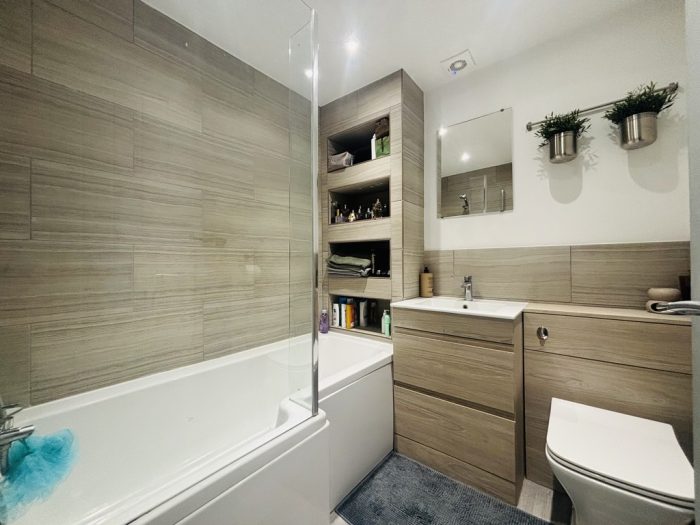 BATHROOM smooth plastered ceiling, ceiling spot lights, extractor fan to ceiling, radiator, wood effect vinyl flooring, panel bath with mixer tap, shower attachment, tiled surrounds, glazed shower screen, hand basin with mixer tap, tiled splash backs, accessory drawers under, low level wc.