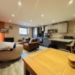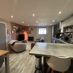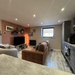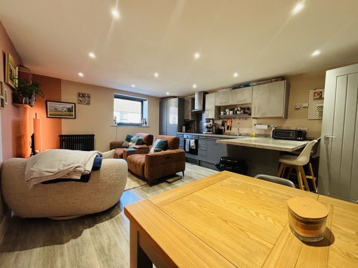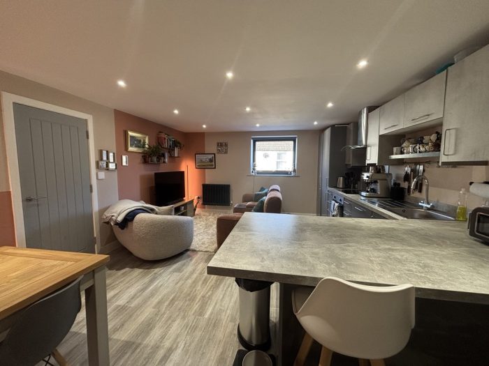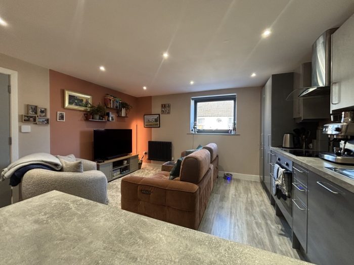 OPEN PLAN LOUNGE/ DINER/ KITCHEN 17' 6" x 13' 9" (5.33m x 4.19m) smooth plastered ceiling, ceiling spot lights, UPVC double glazed window to front aspect, radiator, power points, wood effect laminate flooring, work surfaces with cupboards and drawers, stainless steel sink and drainer unit with mixer tap, built-in dish washer, built-in fridge freezer, fitted storage cupboard housing Vocera combination gas boiler, four ring ceramic hob with built-in electric oven under, ceramic splash back with wall mounted stainless steel and glass canopied extractor hood over, matching wall mounted cupboards, additional radiator, work surface/breakfast bar, additional access from entrance hall.