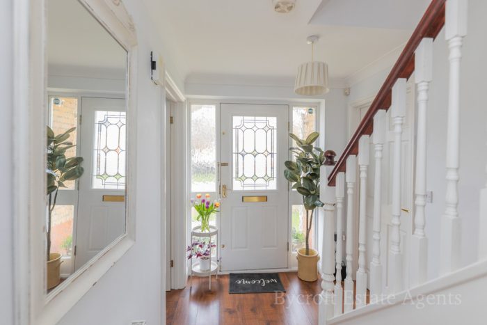 ENTRANCE front door with two fixed side panels, spacious entrance hall, stairs to first floor, under stairs storage cupboard, radiator.