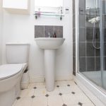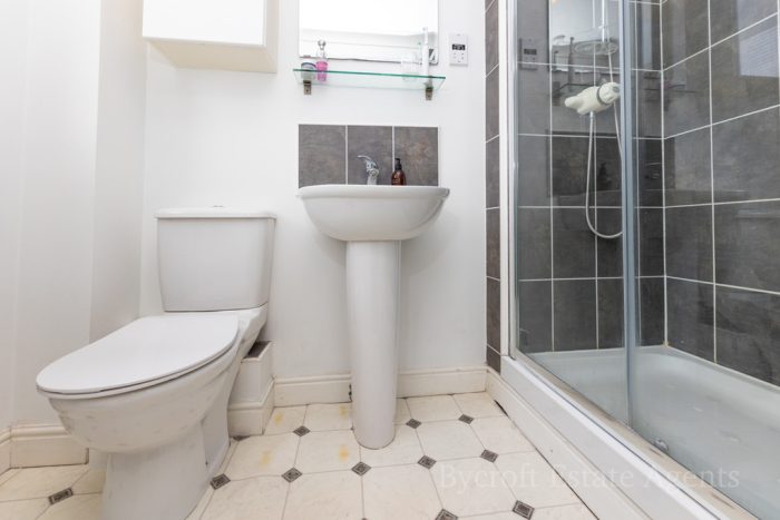 EN SUITE SHOWER ROOM wc with push button cistern, pedestal hand wash basin with mixer tap, large shower cubicle with mains fittings, frosted double glazed window, chrome heated towel rail, shaver point, extractor fan.