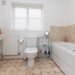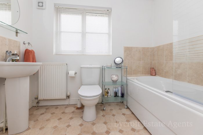 FAMILY BATHROOM pedestal hand wash basin with mixer tap, wc with push button cistern, bath with mixer tap and shower attachment, shower screen, radiator, frosted double glazed window, extractor fan.