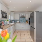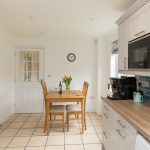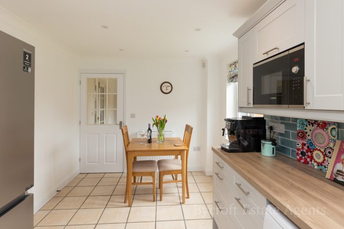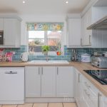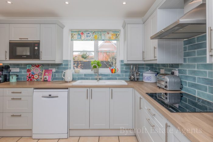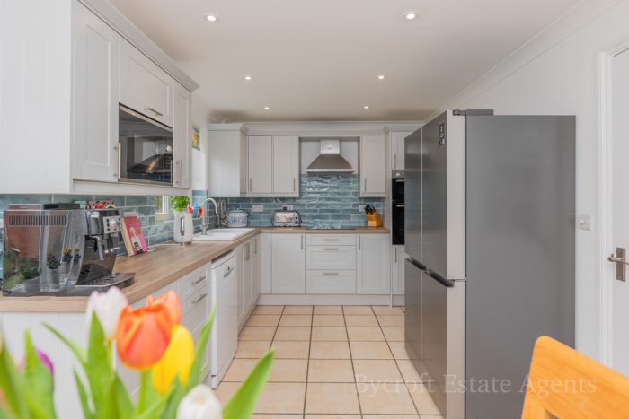 KITCHEN/ BREAKFAST ROOM 16' 11" x 9' 1" (5.16m x 2.77m) newly fitted with L-shaped worktop, good range of base, cupboards and drawers under, built-in Bosch eye-level oven and grill, matching four ring hob, space and plumbing for dishwasher, space for American style fridge freezer, range of wall units, integrated Bosch microwave, white ceramic 1½ bowl sink with mixer tap, lights and extractor, two windows to rear aspect, tiled floor, radiator, downlights. Door to;