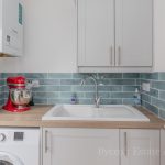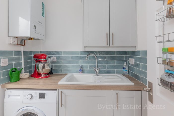 UTILITY ROOM 5' 4" x 5' 2" (1.63m x 1.57m) worktop, base cupboards, space and plumbing for washing machine, white ceramic one bowl sink with mixer tap, double wall unit, Vaillant gas boiler (newly installed in 2025), side door, downlights, extractor fan. tiled flooring.
