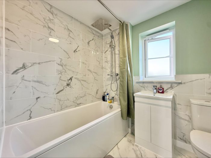 BATHROOM 7' 1" x 6' 1" (2.16m x 1.85m) fitted with a white suite comprising of a low level wc, vanity hand wash basin with mixer tap over and storage cupboards below, panel bath with mixer tap, wall mounted shower unit with hand and soaker attachments over, tiled splashbacks, UPVC double glazed window to front, extractor fan.