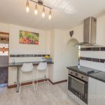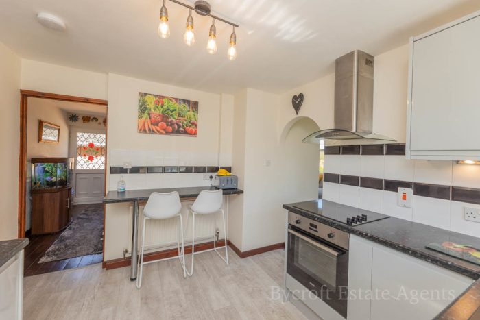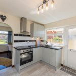 KITCHEN 9' 9" x 10' 7" (2.98m x 3.23m) max range of modern over and under counter units; one bowl sink with mixer tap; integrated oven and hob; light and extractor; breakfast bar; radiator; double glazed door and window to side aspect; space for fridge freezer.