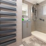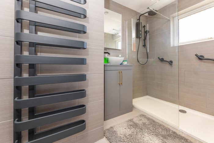 SHOWER ROOM 8' 11" x 5' 10" (2.72m x 1.79m) max modern electric shower with two shower heads; sink with mixer tap and unit under; frosted glass window; heated towel rail.