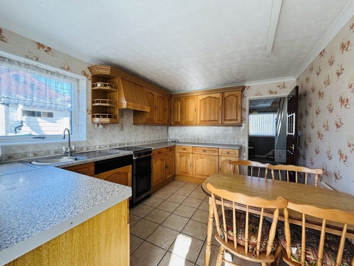 KITCHEN 12' x 10' (3.66m x 3.05m) a mixture of hardwood wall and base units, integrated under counter fridge and dishwasher, space for a freestanding electric cooker, UPVC double glazed window to side aspect, wooden window with views out to the Conservatory with rear door access.