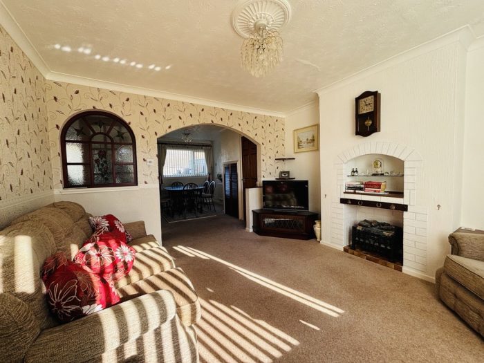 LIVING ROOM 12' x 12' (3.66m x 3.66m) UPVC double glazed window to rear aspect, radiator, feature fireplace currently housing electric fire (could be reopened for the use of a multi fuel burner). Arch opening to;