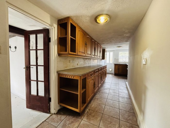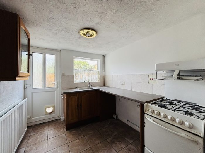 KITCHEN 22' x 6' (6.71m x 1.83m) wall and base units, space for free standing gas cooker, washing machine and tumble dryer, 1½ bowl sink, UPVC double glazed window, radiator, UPVC double glazed door out to rear courtyard.