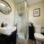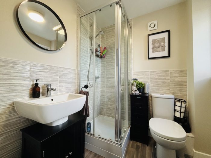 EN SUITE 6' x 6' (1.83m x 1.83m) walk-in shower with mains fittings, hand wash basin, wc, UPVC window, radiator.