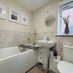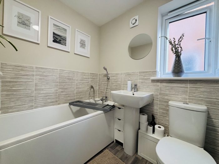 FAMILY BATHROOM 6 ' x 5' (1.83m x 1.52m) UPVC double glazed window, radiator, bath with hand held shower, hand wash basin, wc,