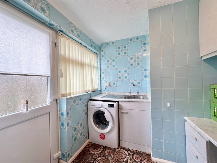 UTILITY ROOM 11 max into cupboard' x 6' 10" (3.35m x 2.08m) fitted with a range of wall and base units; plumbing for automatic washing machine; inset stainless steel single drainer sink; UPVC double glazed window and door to side.