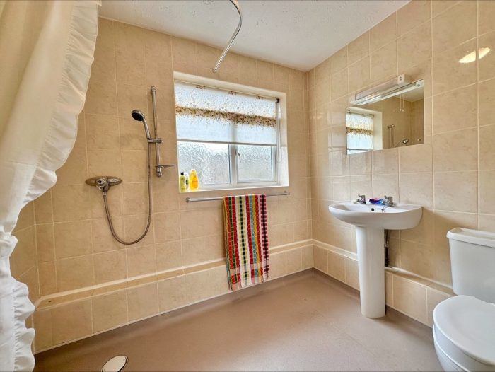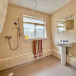 SHOWER / WET ROOM 7' 10" x 6' 5" (2.39m x 1.96m) fitted with a white suite comprising of a low level wc; pedestal hand wash basin; wall mounted shower unit; fully tiled walls; UPVC double glazed window to side.