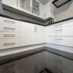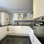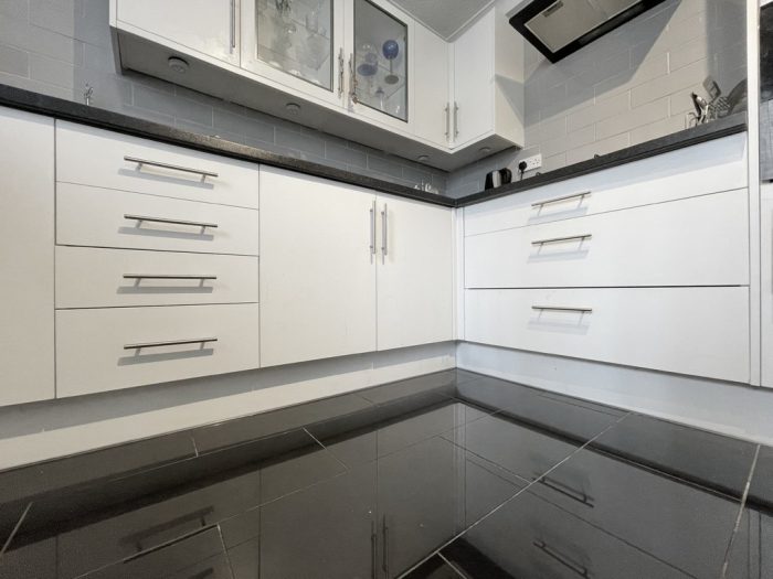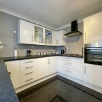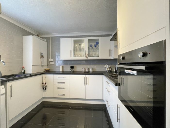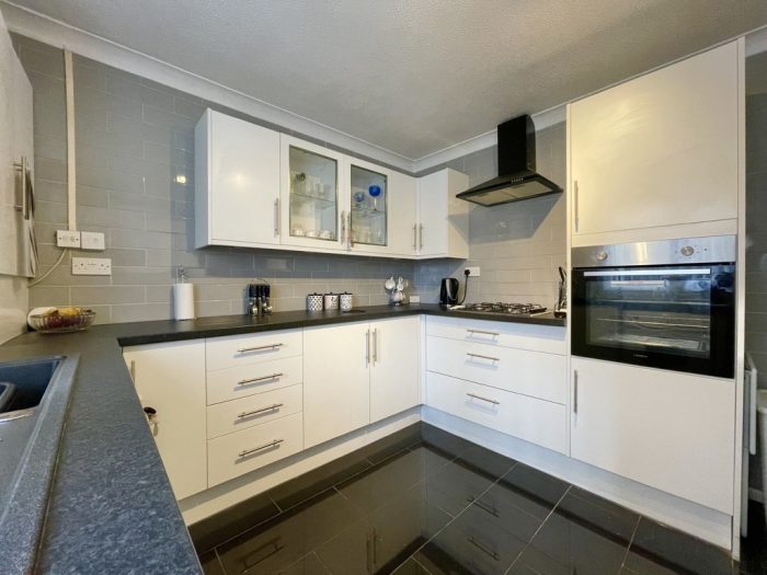 KITCHEN 10' 2 plus door recess" x 10' 0" (3.1m x 3.05m) fitted with a range of modern wall and base units; inset single drainer sink with mixer tap; built in electric oven and inset gas hob with cooker hood over; plumbing for automatic washing machine; tiled flooring; fully tiled walls; UPVC double glazed window to side.