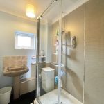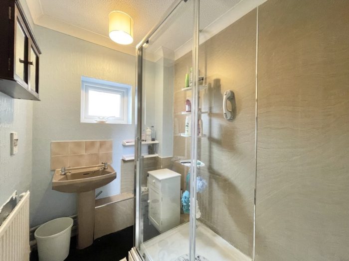 SHOWER ROOM 6' 10 max" x 5' 2 max " (2.08m x 1.57m) fitted with a walk in shower cubicle with sliding shower screen door, wall mounted shower unit with aqua board wall coverings; pedestal wash hand basin with tiled splashback; shaver point; UPVC double glazed window to front.