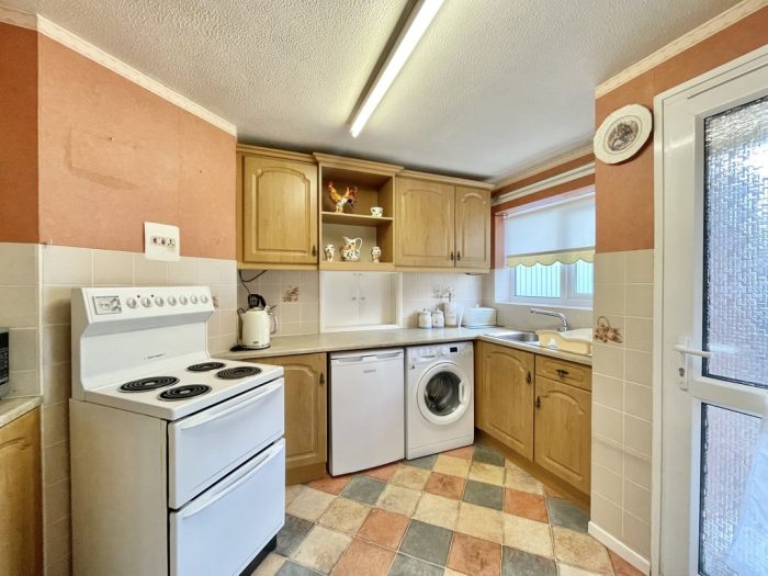 KITCHEN 11' 2" max x 8' 8" (3.4m x 2.64m) fitted with a range of wall and base units with roll edge worksurfaces over; inset stainless single drainer sink with mixer tap over; electric cooker point; plumbing for washing machine; space for fridge/freezer; upvc double glazed window to side; tiled splashbacks; floor mounted oil fired central heating boiler' upvc double glazed door to side; walk-in pantry 5'8" x 2'7" max.