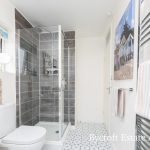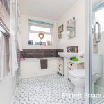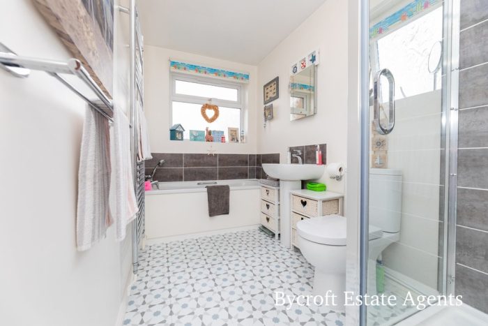 FAMILY BATHROOM 11' 7" max x 5' 5" (3.53m x 1.65m) fitted with a white suite comprising of a pedestal wash hand basin; low level wc; panelled bath with mixer tap and hand shower attachments; tiled splashbacks; corner quadrant shower cubicle with wall mounted shower unit with hand and soaker attachments; UPVC double glazed windows to side and rear; wall mounted mirror; heated towel rail radiator.