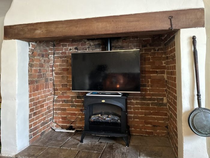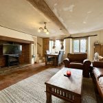SITTING ROOM 17' 8" max x 15' 1" (5.38m x 4.6m) door to front; UPVC double glazed window to front; pamment tiled floor; inglenook style fireplace with brick surround and tiled hearth; door leading to Norfolk winder staircase; feature central beam.