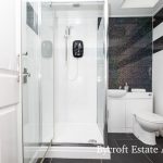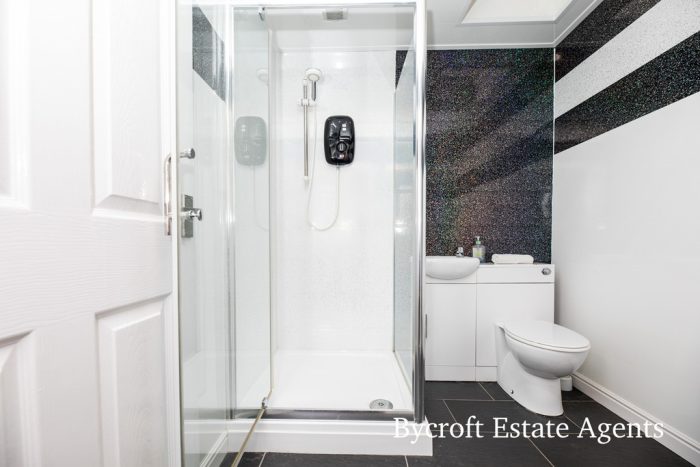 BATHROOM large shower cubicle with mains fittings; vanity unit with wash hand basin and double cupboard under; wc; bath; frosted window; radiator; shelved recess.