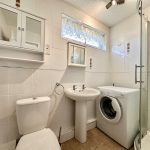 SHOWER ROOM wc; pedestal wash hand basin; shower cubicle with Mira shower fittings; fully tiled walls; tiled flooring; chrome heated towel rail; frosted window; mirrored wall cabinet; washing machine.