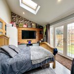 BEDROOM 6 / CINEMA ROOM 17' 7" x 9' 8" (5.36m x 2.95m) UPVC double glazed French door to rear flanked by two full height UPVC double glazed windows to rear; walk in cupboard measuring 8' 9" x 4' 6" max with two roof light windows to rear.